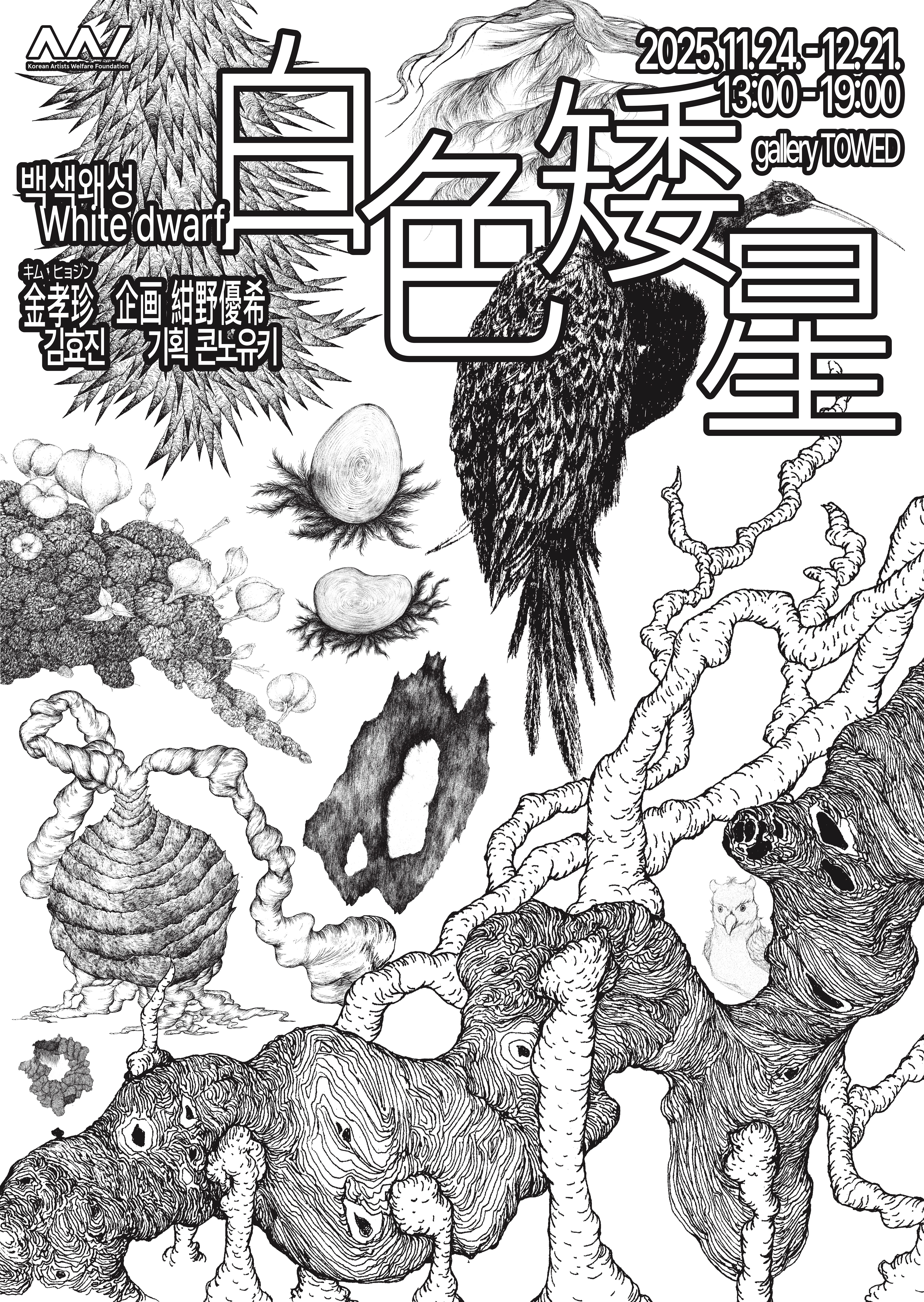 白色矮星(英:white dwarf)は、エネルギーが核融合反応によって生み出されなくなった、星の残骸を指す言葉だ。 キム・ヒョジン(金孝珍、1990年生まれ)にとって白色矮星はどんなものだろうか。韓国から来て、日本に滞在しながら、日本で子供を持つようになって、不思議で親しみのある感情を抱いた。出産の経験はエネルギーを奪い、身体をからっぽにしてしまうのか。身体は、最も身近でありながらも、未知の場所である。力を内に秘めた——卵やつぼみのような形で、絵の中に登場する。どこかにつながっていると信じる気持ちが地上と空を、過去と現在を、韓国と日本を行き交う。地上で星を見るように、遥か先に生命力が芽生える。(紺野優希)